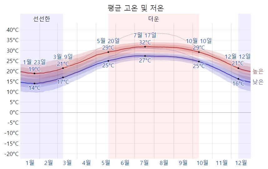 - 여름(6~9월): 평균 30℃ 이상, 습도 80% 이상, 태풍과 비 자주 동반