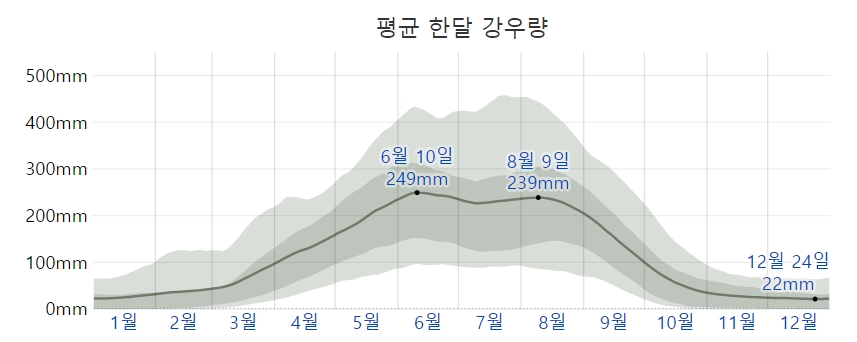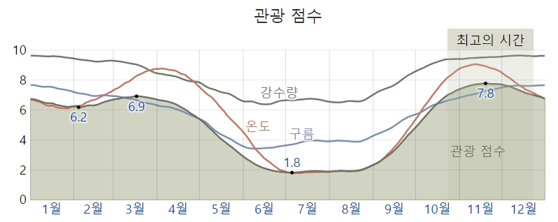 | 날씨 변화 | 여름: 고온다습 & 태풍 가을: 맑고 쾌적 겨울: 선선하지만 온화 |