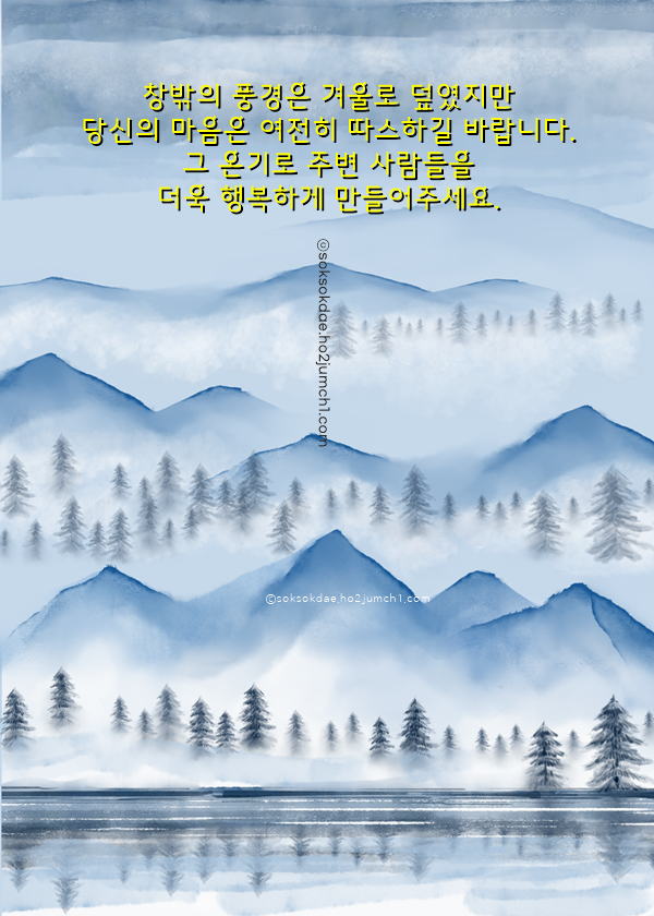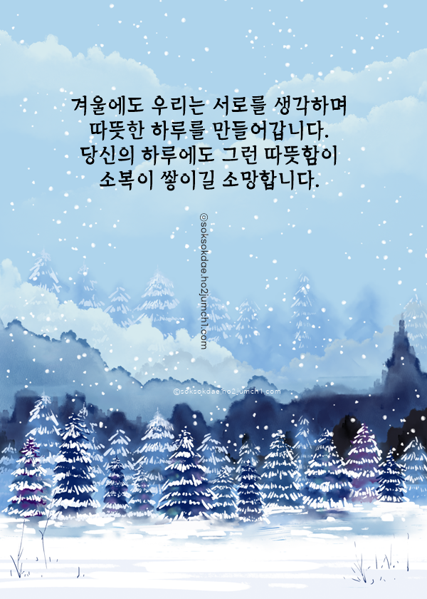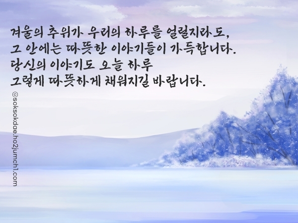 한겨울 바람이 너무 매서워서, 요즘은 마음조차도 자주 움츠러드는 것 같습니다. 그럴 때일수록 서로 안부 나누는 말 한마디가 큰 위로가 되더라고요. 늘 건강하시고, 따뜻한 하루 보내시길 바랍니다.
