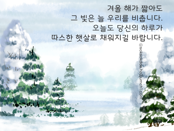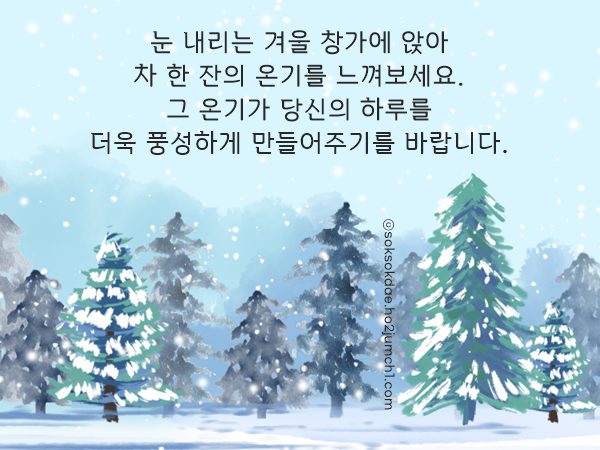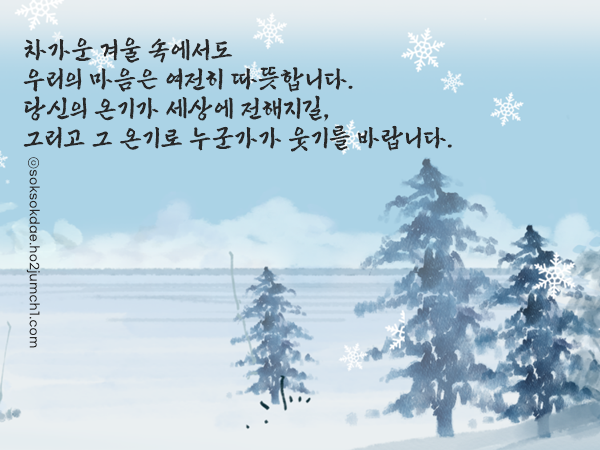 요즘 날씨가 부쩍 매서워졌습니다. 소한 지나고 대한 앞두니 겨울이 본색을 드러내는 느낌이네요. 이런 때일수록 몸도 마음도 더 챙기셔야 할 것 같습니다. 별일 없으신지 문득 안부가 떠올랐습니다. 따뜻하게 지내고 계시면 좋겠습니다.